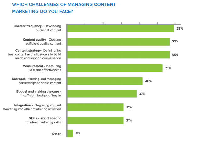 Cette étude démontre aussi qu’environ un quart des entreprises ont décidé d’accroître cette production en interne, tandis que 28% ont augmenté le budget alloué à leur agence de Content Marketing. Par ailleurs, Hubspot et Smart Insights mettent en avant que les défis à relever pour les responsables marketing restent de produire assez de contenus pour être efficaces (58%), élaborer des contenus de grande qualité (55%) et développer une ligne éditoriale (55%).