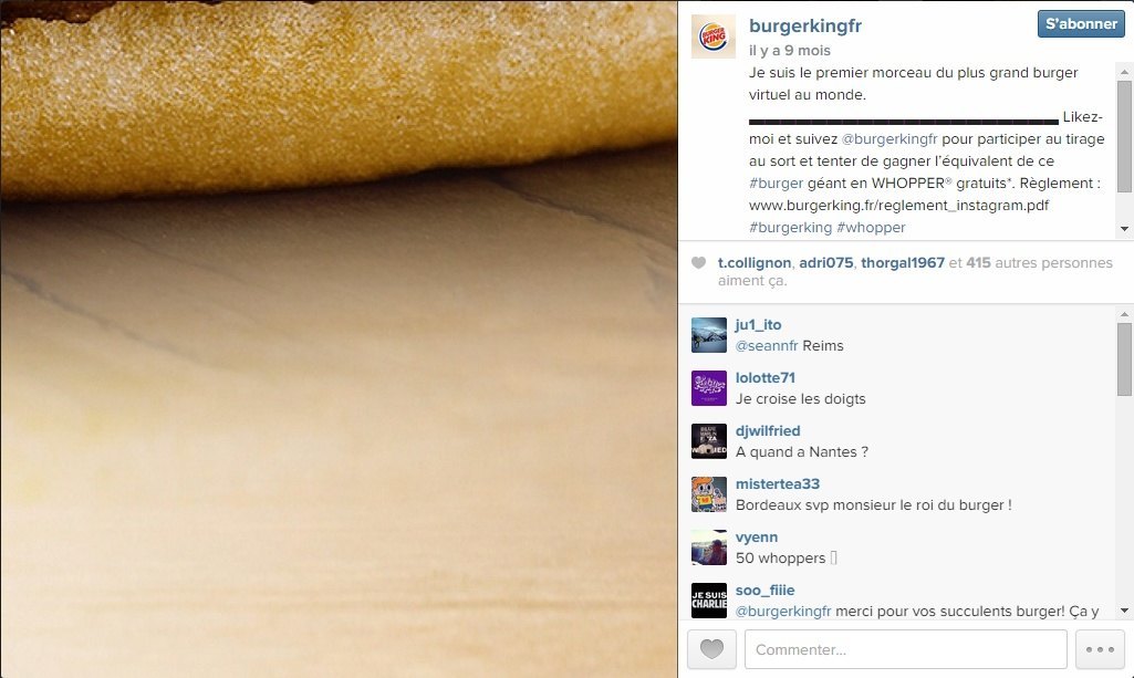 Par exemple, au moment du lancement de son compte Instagram, Burger King a lancé un concours pour gagner 50 Whoppers, la star de ses hamburgers.