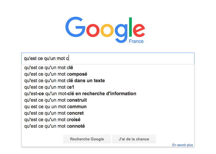Google Autocomplete : Il arrive souvent que vous commenciez une recherche et que Google vous offre directement plusieurs propositions pour terminer votre phrase. Ces propositions sont bien entendu basées sur les recherches les plus effectuées, et vous donnent donc des indications sur les mots-clés utilisés.
