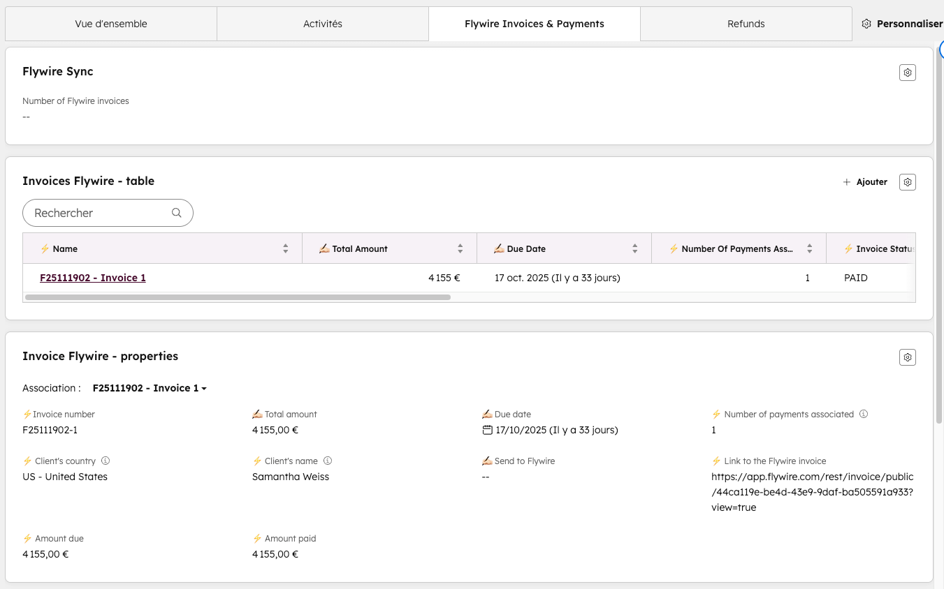 - Structure des données : Pour supporter cette intégration, des objets personnalisés ont été créés dans HubSpot : "Invoices Flywire", "Payment Flywire" et “Refund”permettant de stocker et d'associer précisément toutes les informations financières à chaque transaction.