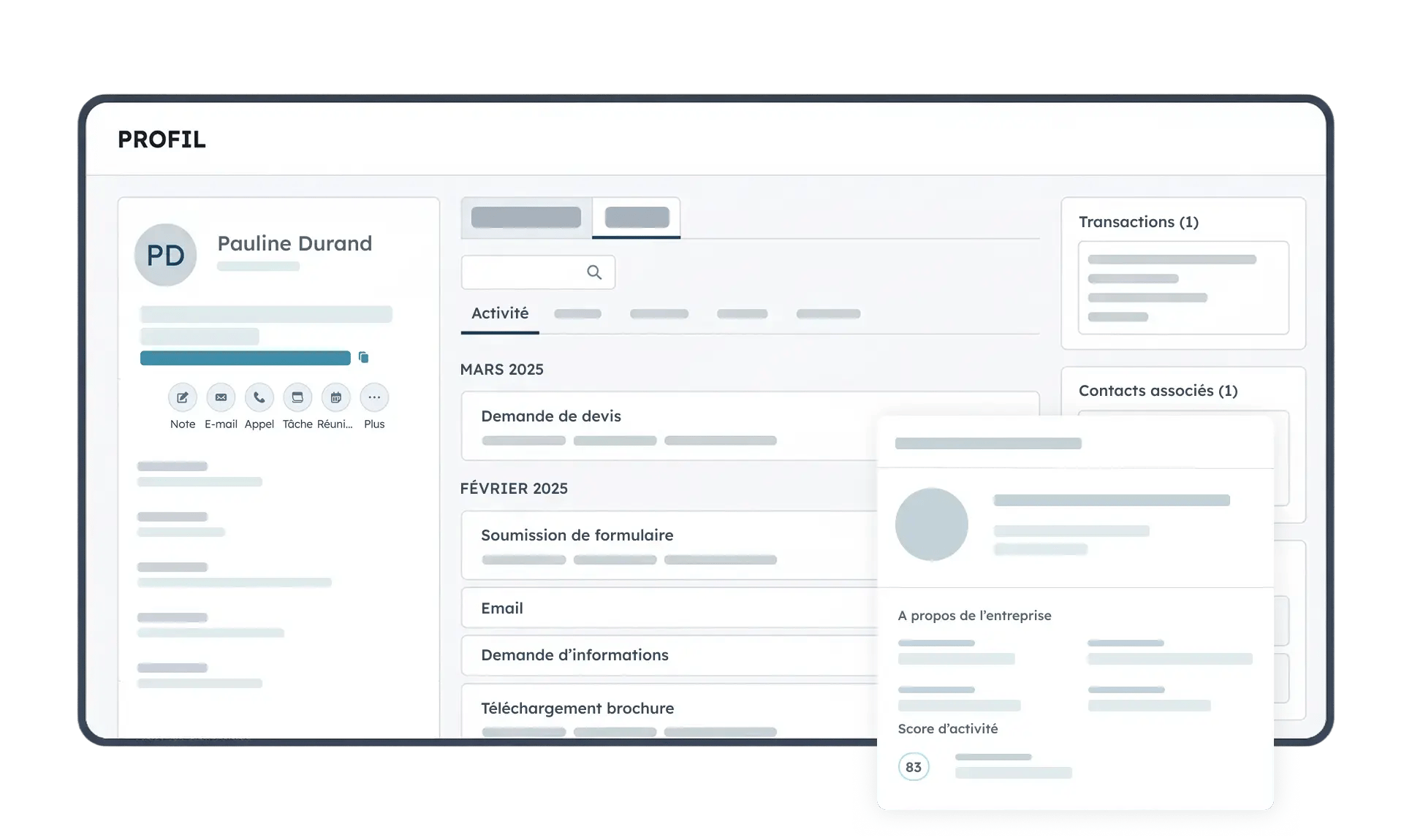 - Fiches enrichies avec propriétés personnalisées : type de contact, produits souscrits, phase du cycle de vie, statut du lead