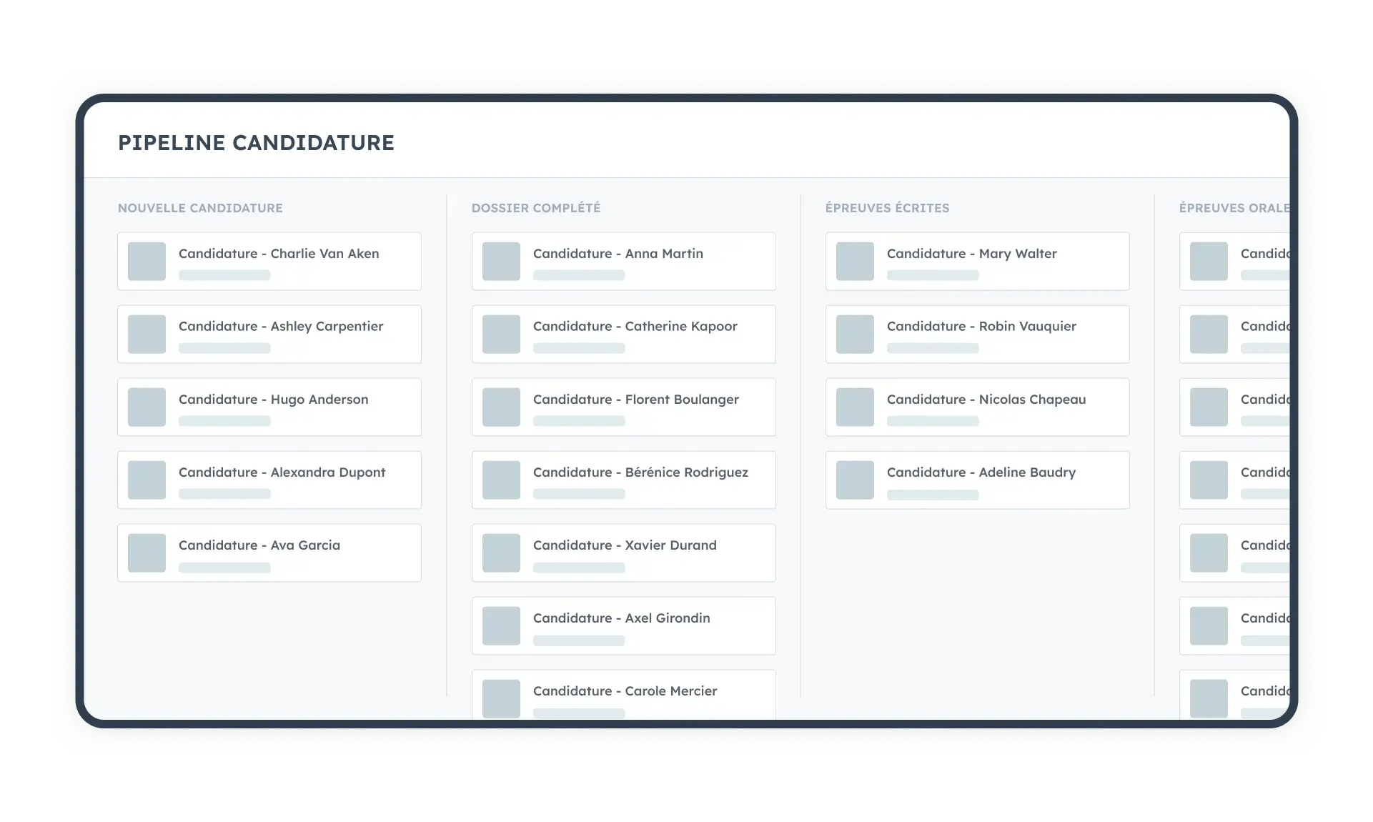 - Pipeline de candidature personnalisable par formation (concours, dossier, entretien…) avec vues filtrées par école ou campus